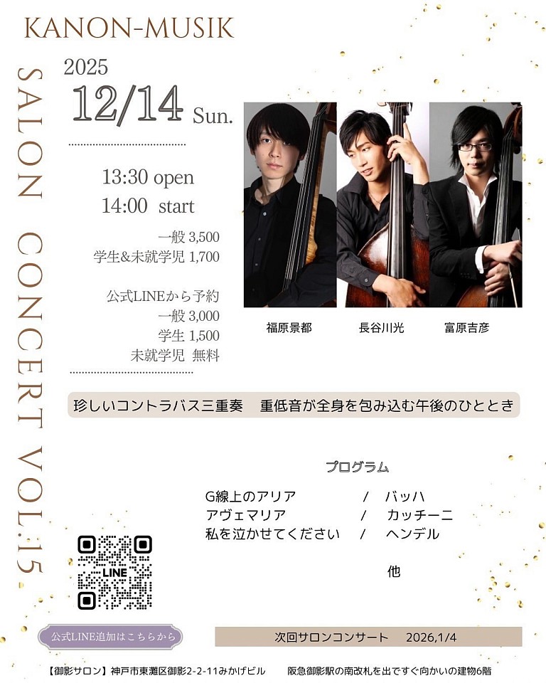 コントラバスや低音楽器で「ジャンルを超えた魅力」「低音の奏でる音の魅力」「私自身が奏でる魅力」を感じていただき、皆様に楽しんで頂ける様、日々努力しております。